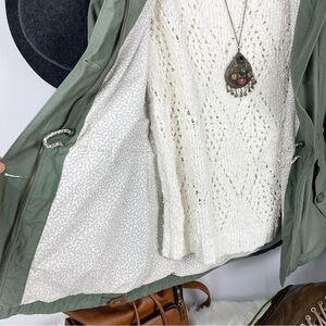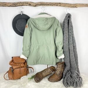 Adorable light jacket by Columbia perfect for spring and fall. It is a cotton blend with sage green shell and a white interior lining featuring a micro floral print. the zipper pulls, and logo are made from a brown leather giving this jacket an organic, earthy feel. The hood has a drawstring and is detachable. there is also a draw string at the waist and along the bottom so that you can customize the fit. excellent overall condition, with the exception of a small mark on one sleeve cuff (see last photo). Size Small.