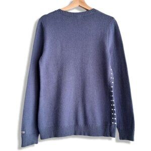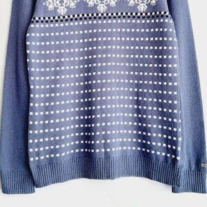 • Long sleeve crewneck pullover top in purple undertone blue with with traditional snowflake and geometric pattern in contrasting white and black yarn.