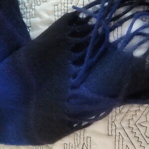 Elegant scarf. Features a blue and black plaid pattern. Soft and stylish with fringe detail.