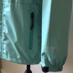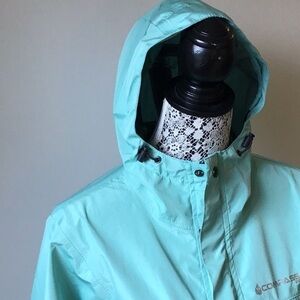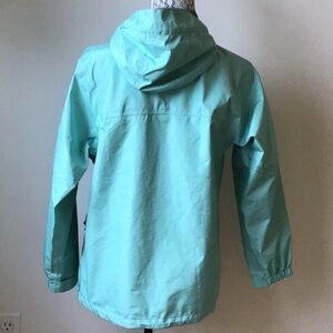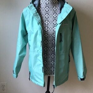 Aqua colored rain jacket with fully taped seam. Zips up with flap closure to prevent water seeping in through zipper Cinchable hood and hem. Adjustable at cuffs.