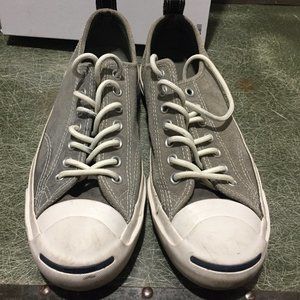 Converse Jacke Purcell Unisex Leather Sneaker, Size 7.5 Men, 9 Women, Color Grey, Brown, White, Upper Genuine Leather, Lace Up, Good Condition, Comfortable Sneaker, Great Look, Great Fitting.