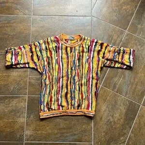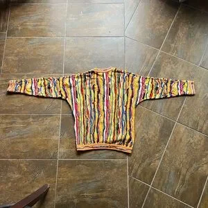 Authentic vintage COOGI Australia sweater featuring the brand’s signature bold, textured 3D knit pattern. Rich multicolor palette with heavy cotton construction and classic ribbed collar, cuffs, and hem.