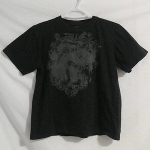 Short sleeved black t-shirt with a detailed grey graphic design on the front