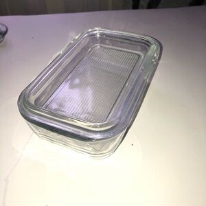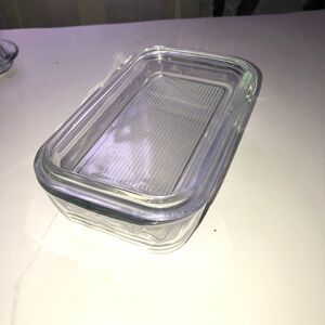 Vintage Arc France Elegant clear glass butter dish. Perfect for any kitchen setting. Durable and stylish with ribbed bottom, this butter dish holds a pound of butter. We keep one in the fridge and one in the cupboard as butter doesn’t last long here. Sometimes if we have leftovers , we will pop in here if we don’t have a container- excellent shape no chips or cracks.