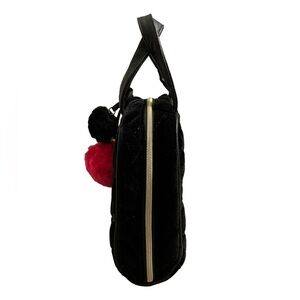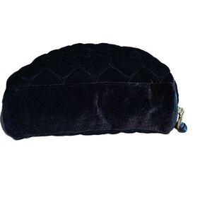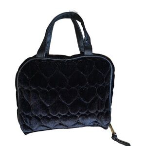 An uncommon find! Betsey Johnson black velvet toiletry/makeup bag. Quilted heart pattern on black velvet with pompom embellishment. Lined with classic rose patterned satin, the interior boasts a roomy main compartment and 4 side slip pockets. This bag is is very good, clean condition with the zipper working perfectly!