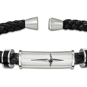 Handcrafted of solid stainless steel with etched cross, black sapphire centre, braided leather band, magnetic clasp and sentiment. With gift box.