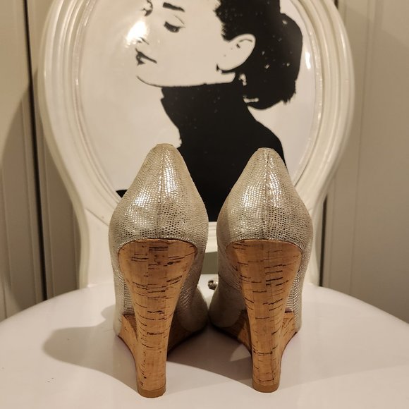 Betsey Johnson Silver Open Toe Wedge Heel with Bow and beautiful pink sole (picture of women's face blinking one eye). Heel is 4.5" Wedge with cork like material