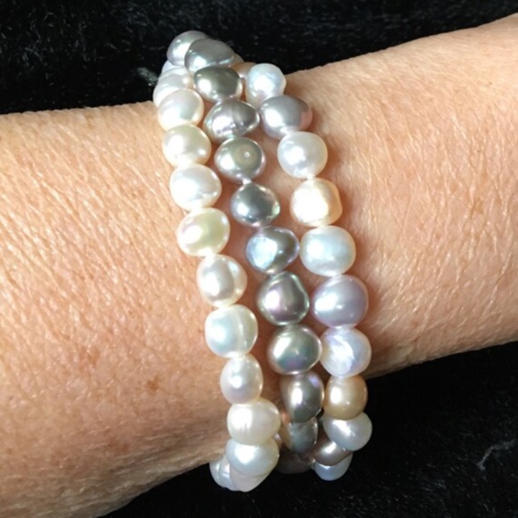 This was designed by Vantel Pearls, and called “Angelic Bracelet”. The clasp is marked 925. It sits very comfortably on the wrist. The 3 strands measure about 7”, with a Vantel tag at the end of the extension chain. In total, it is about 9”. It sold for US$83. Brand new.