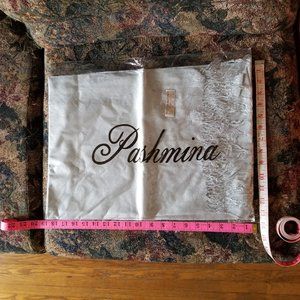 NWT in original bag, pashmina scarf = cashmere, unisex, men's or women's scarf, double sided, plain weave, no pattern, pale gray/light grey, summer shawl, stole, wrap, or winter scarf, or year round head covering, hijab, boho style, with a fringe. Size OS, width inches ~27, length inches 72, including fringe. Material 70% pashmina wool, 30% silk (pashmina & cashmere, soft, not itchy, world's finest wool). Season all year, spring, summer, fall, winter, condition new. Washing info. shown on the label or hand wash, cold water, air dry.