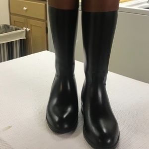 equestrian classic, Riding Boot, in smooth leather with signature Logo on brown Leather upper. Designed with a comfortable small flat heel, it works with midi skirts and dresses and over leggings jeans etc., — wear with bare legs now, tights later, to transition from warmer to cold weather.
