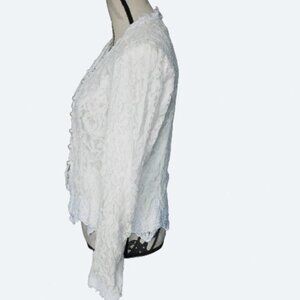 Embrace timeless elegance with this vintage Galleria cream lace top blazer. The intricate lace overlay is beautifully complemented by pearl buttons and details, adding a touch of sophistication. The structured design features shoulder pads, offering a classic silhouette that's both flattering and stylish. Perfect for special occasions or adding a vintage charm to your wardrobe