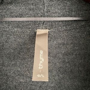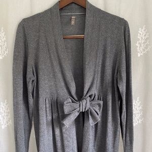 Soft grey cardigan with cute empire waist (attached ties). Rouched /pleated back for a pretty silhouette.