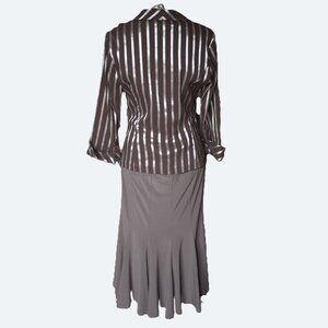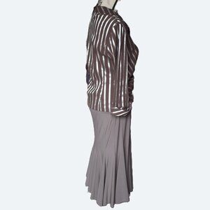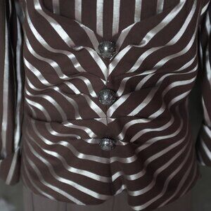Elevate your wardrobe with this chic Joseph Ribkoff set, made in Canada. The blazer features a striking metallic brown and white stripe pattern with a flattering waist-cinching design, finished with three statement buttons. Paired with a flowy, pleated skirt in a matching taupe shade, this set is perfect for special occasions or polished office wear. In excellent used condition, it's a versatile and timeless ensemble