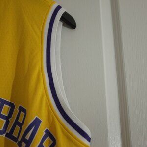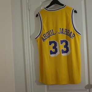This Los Angeles Lakers jersey by Links Marketing Group features the iconic number 33, paying homage to basketball legend Kareem Abdul-Jabbar. The jersey comes in a classic yellow color with purple and white accents around the armholes and neckline. It is made from a lightweight, breathable fabric, ideal for both sports and casual wear. The size is XL, offering a comfortable and roomy fit. This jersey is perfect for Lakers fans and collectors alike, celebrating one of the most famous players in the team's history