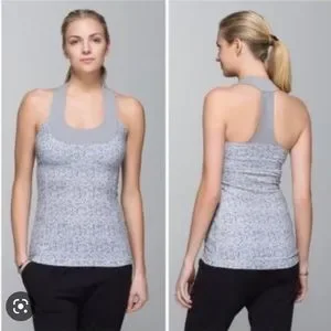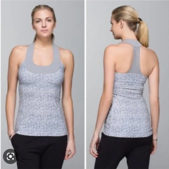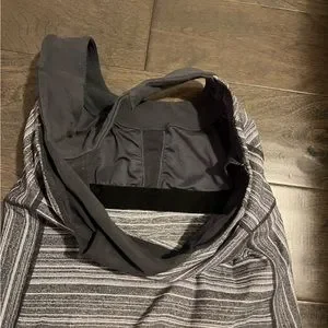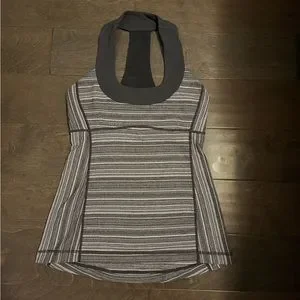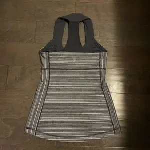 Size 4. Good used condition. Solid grey neckline with a stripped pattern body. Built in sports bra. Mesh racerback material. Flattering fit, supportive in bust area, very comfortable.