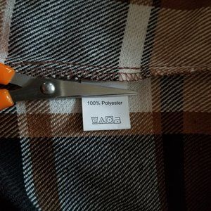 Large plaid, check, colour block pattern, long sweater/top, browns, blacks, white, mock neck or fold down collar. NWOT, not worn, soft polyester, Shein Curve. 1/4 zip in the upper front and mock neck of the top. Base has side slits ~4 inches long. Size women's XXL, 2XL, or oversize L, XL, measurements in inches: pit to pit 23, sleeve length 23, base width 24, length 27.5. Can be unisex men's size L, XL. Machine wash warm, dry on low.