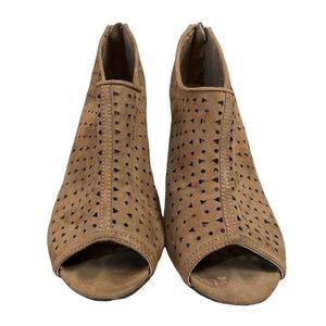 Open toe zipper heel perforated 3” heel tan suede shoes size 7