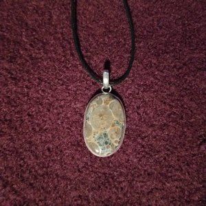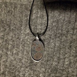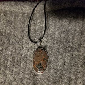 Peanut obsidian gemstone oval pendant necklace jewelry/jewellery, ~1.5 inch stone cabochon, silver plate on a black cord, unisex, attractive browns, oranges, greys, and blacks, neutral colours. Photo 3 shows the colour best.