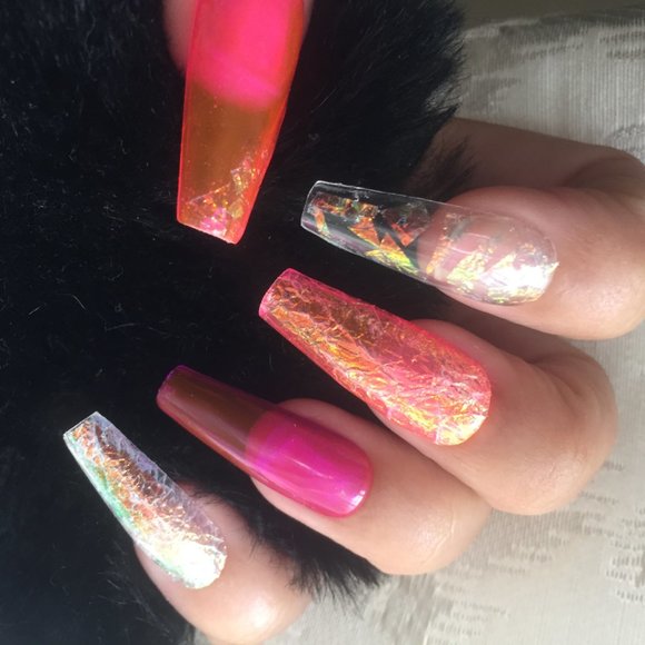Pink/Purple Jelly n Iridescence foil press on nails Can be used with sticky pads for short time wear. Or glue on for up to two week hold . For best results,