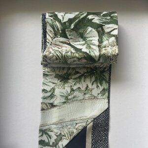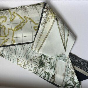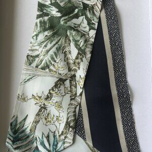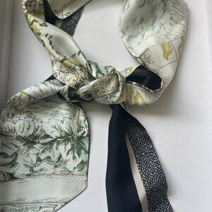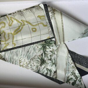 This unique patterned scarf is the perfect fashion accessory, meticulously crafted from a blend of two original prints. You can wear it around your neck, tie it in your hair, drape it on your favorite bag, or use it as a belt. It's made entirely from 100% mulberry silk and is entirely handmade.