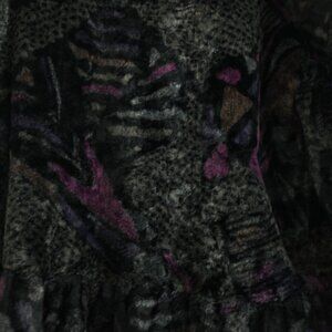 This Sirbain faux fur coat in size XSP (Extra Small Petite) features a unique abstract print in shades of black, grey, and purple. The plush texture and intricate pattern create a luxurious, artistic look. With a hoodie for added warmth and style and a relaxed fit, this coat offers both comfort and sophistication. Perfect for making a statement during colder months, it combines warmth with high-fashion flair.