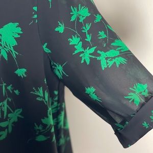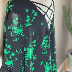 A 9-to-5 top with 9-to-whenever-the-sun-comes-up details. Fully lined black chiffon offers a work-ready silhouette, complete with an HR-approved green floral print and a flattering gathered bottom, sheer cuffed sleeves. The cutout back, however, rocks a strappy cage back that'll get you noticed when you shrug off that blazer.