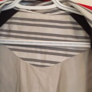Striped lululemon track attack jacket with thumb holes great condition fits like a size 6 it has 3 tiny holes inside that I just noticed now so just barely noticeable but other then that great condition