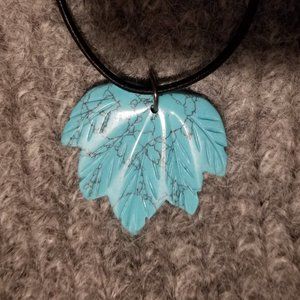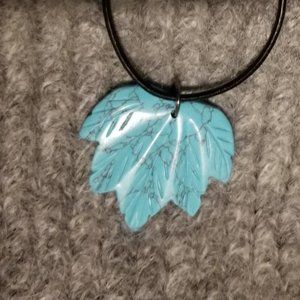 Turquoisite gemstone maple leaf pendant necklace jewelry/jewellery, ~1.75 inch long carved stone, NWOT, on a leather black cord, unisex. Turquoisite is dyed howlite or magnesite.