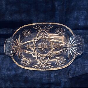 Vintage Anchor Hocking , pattern is known as Star of David. It is oval shaped, approximately 10 inches long at longest point of handles, 6 inches wide at the widest point, and 1 1/4 inches deep. It is divided into two sections, lengthwise.