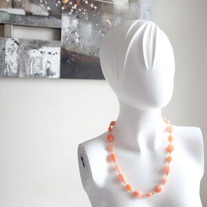 Add a touch of retro charm to your ensemble with this Vintage Plastic Lucite Peach Swirl Bead Necklace. Featuring peach-hued beads with swirling patterns, this necklace exudes elegance. Perfect for adding a pop of colour to any outfit