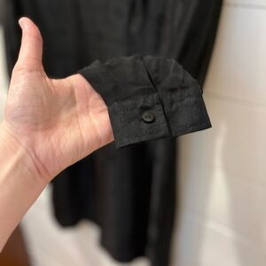Robe noire élégante et féminine avec empiècements en voile sur le haut et les manches, motifs discrets en ton sur ton et col chemise raffiné. Fermeture boutonnée au dos. Légère et légèrement évasée, parfaite pour les soirées ou en superposition avec style.