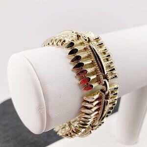 Dating to c. 1950s - 1960s, this well-made, sturdy Coro bracelet is comprised entirely of lustrous pale gold (aka, silvery gold) tone metal and does up with a fold-over clasp.
