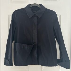 COS black collared jacket, size 4. 97% cotton, 3% spandex so it’s got a bit of stretch. It’s photographing a little more washed out than it really is. Worn often but in good condition. Large sort of “floppy” pocket on one side.