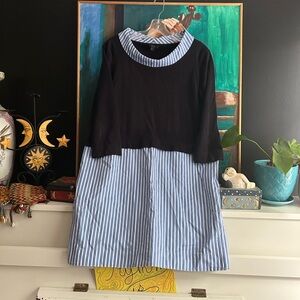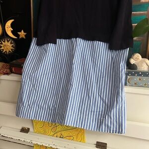 Stylish dress with a black top and blue striped skirt. Ideal for casual outings.