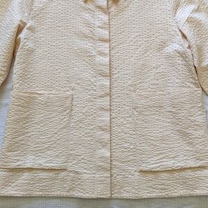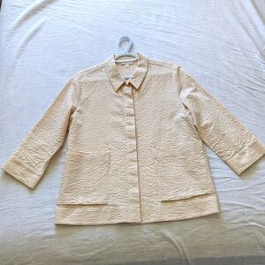 EUC, like-new. Amazing quality, interesting texture, nice neutral peachy/creamy colour. Can be worn as a shirt as pictured or even as a very cute light jacket/open shirt. 109% cotton.