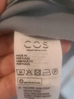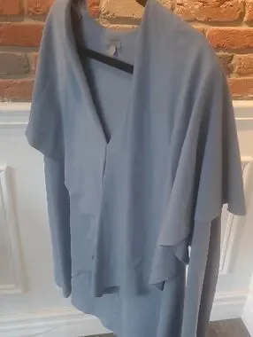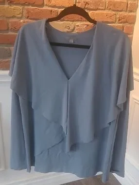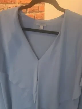 Minimal v neck top in a soft light blue hue. Smooth knit with ruffle bib. Subtle, modern aesthetic. Easy to style for layered looks.