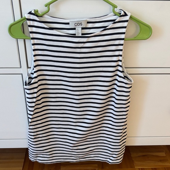 Stylish tank top with classic black and white stripes. Ideal for casual wear. Like new Non smoker home