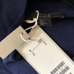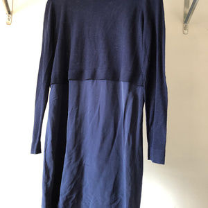 Beautiful navy shirt dress, merino wool upper, silk button down lower