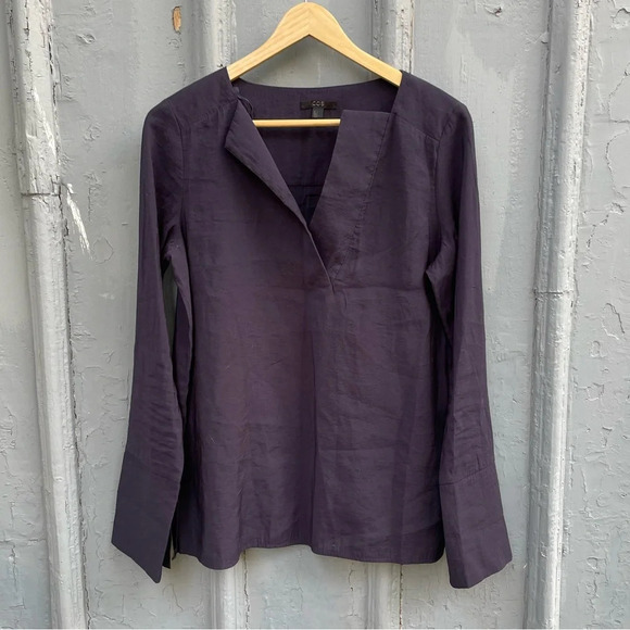 COS long sleeved Navy Tunic top. Collarless with V neck , long cuffs, can be rolled.