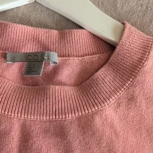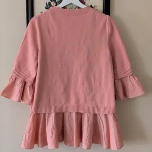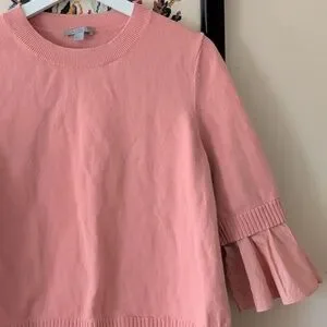 Soft light pink knit top with crew neckline, bell sleeves and ruffle hem. Ribbed trim around neckline, cuffs and hem and feminine peplum detail.