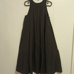 This black modal-blend dress is cut for a midi length and has an elasticated racer neck with soft gathered pleats at the back. Relaxed fit- Sleeveless with side-seam pockets.