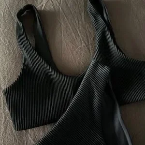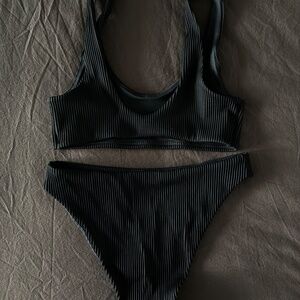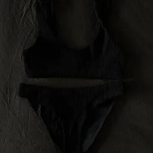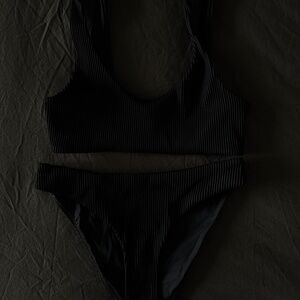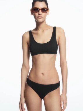 Minimalist ribbed bikini set from COS in classic black. Features a scoop-neck top with slim straps and matching textured bottoms. Timeless Scandinavian design and very flattering fit.