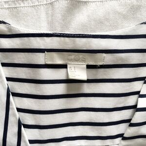COS STRIPED LONG SLEEVE V-NECK TUNIC BLOUSE, A white navy vertically and horizontally striped long sleeve tunic blouse that can also be worn as a trapezoide shift mini dress with long sleeve with one button fastening at cuffs - v-neckline / surplice style - unlined - collarless and stretchy - oversized and loose fit - comfy yet structured and formal. Perfect spring and summer workwear to a formal reunion - family reunion or just a friends gathering.