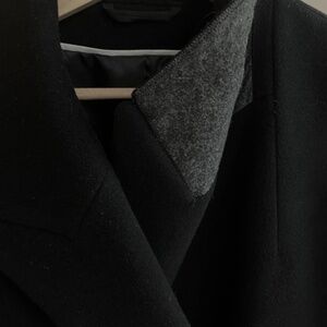 Designed using fabric from Italian textile innovators, Manteco, this enveloping black coat takes influence from menswear tailoring and is crafted from a responsibly sourced wool blend. It has an oversized collar and notch lapels, as well as dropped shoulders and front welt pockets. The premium stitching of the coat further elevates this elegant design. 76% RWS Wool
