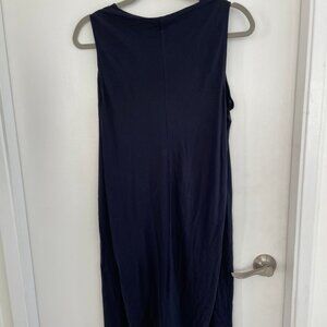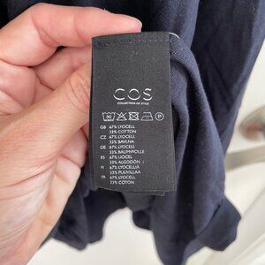 This is a beautiful COS dress which has a nice architectural element with an attached cape like back which drapes really nicely. It is a navy blue