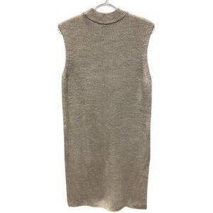 A COS sleeveless ribbed knit sweater dress. Features a mock turtleneck and a ribbed knit texture. The design is sleeveless and falls to about knee-length, making it suitable for layering or wearing on its own in milder weather. A fine gauge knit, giving the dress a refined and potentially more formal appearance. COS is known for its minimalist and contemporary designs, and this dress aligns with that aesthetic.