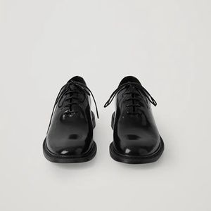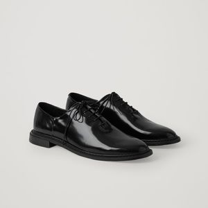 A shiny take on a classic piece of footwear, made from leather these brogues feature hidden laces with a rounded toe. Wear with wide-leg trousers and oversized knitwear.