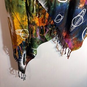Vibrant shawl with celestial designs. Features stars, moons, and planets. Perfect for adding a pop of color. Whimsical and fun. Can be used as a scarf, a shawl or a sarong (beach cover), head scarf.