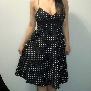 COSTA BLANCA 50's style black & white polk-a-dot flared dress w v-neck front detailing; perfect for weddings or a night out; worn only once