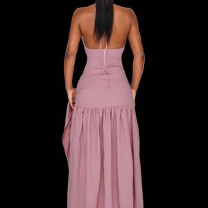 Illusion midi dress in Chilled Rosé. Halter plunge bodysuit with conjoined skirt piece, crafted in thick, crisp textile. Tie at the side to reveal as much as you want.